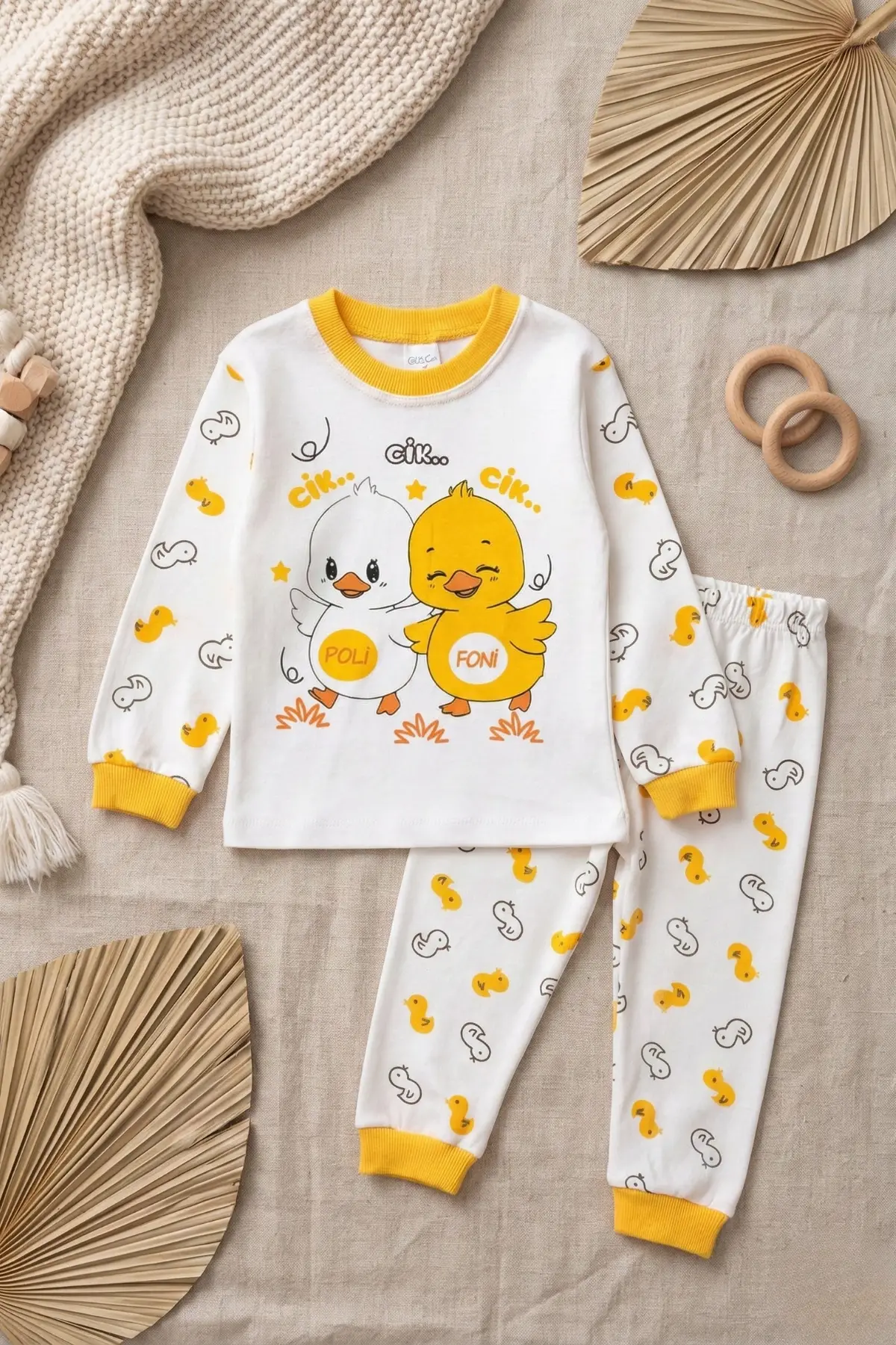 PoliFoni markasının özel tasarımı olan bu unisex pijama takımı, %100 pamuk kumaşıyla çocuğunuzun rahatını düşünüyor. Civciv deseniyle sevimli bir görünüme sahip olan pijama takımı, hem kız hem de erkek çocukları için uygundur.