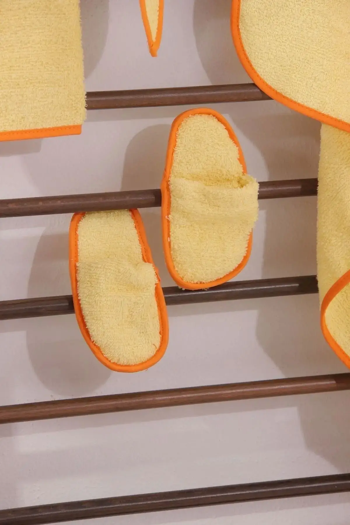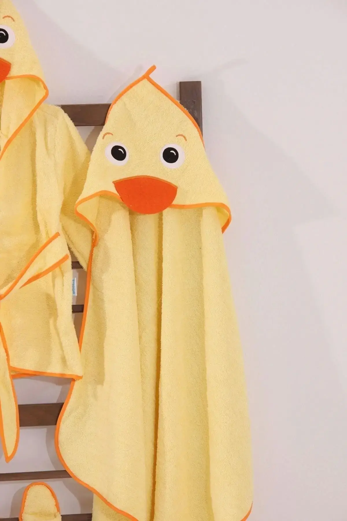 Buude markasıyla özel olarak tasarlanmış 4 parça unisex bornoz seti, miniklerin banyo keyfini renklendiriyor. Yumuşacık kumaşı ve sevimli ördek figürüyle çocuklarınız hem şık hem de konforlu hissedecek.