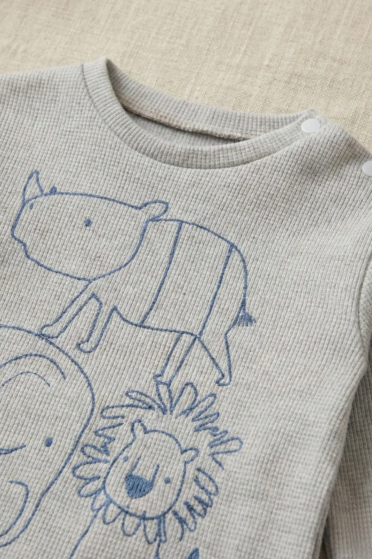 Erkek bebekler için ideal bir seçenek olan Safari Baskılı Waffle Kumaş Mevsimlik Erkek Bebek Takımı, hem günlük kullanım hem de özel günlerde tercih edilebilir.
