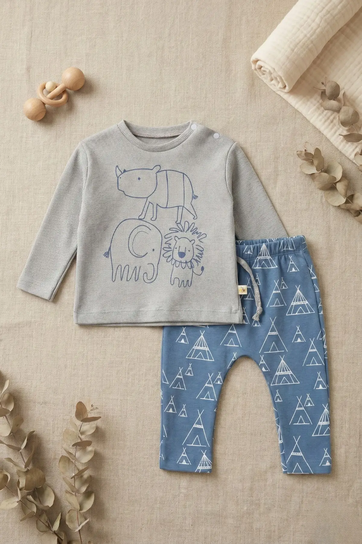 Safari desenli baskılı waffle kumaş kullanılarak üretilen Air Baby mevsimlik Erkek Bebek Takımı, hem şık hem de konforlu bir seçenektir.